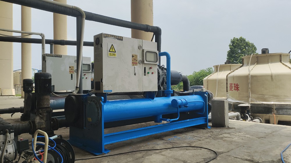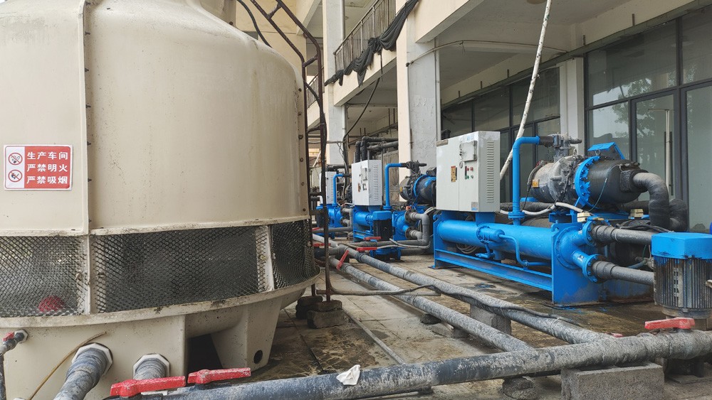 5臺(tái)80P螺桿冷水機(jī)對(duì)1個(gè)10噸的保溫水箱恒溫,使水箱24小時(shí)保持在18.5度,10臺(tái)不銹鋼水泵對(duì)車間10條鉆石培肓生產(chǎn)恒溫恒壓供水。